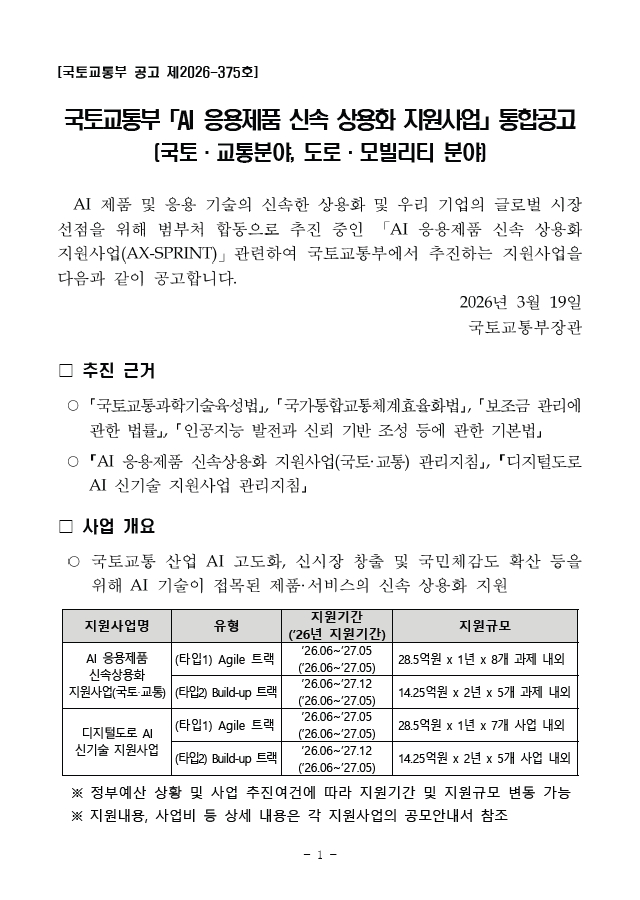 [통합공고문] 국토교통부 「AI 응용제품 신속 상용화 지원사업」 통합공고(국토·교통분야, 도로·모빌리티 분야) 공지사항 상세보기